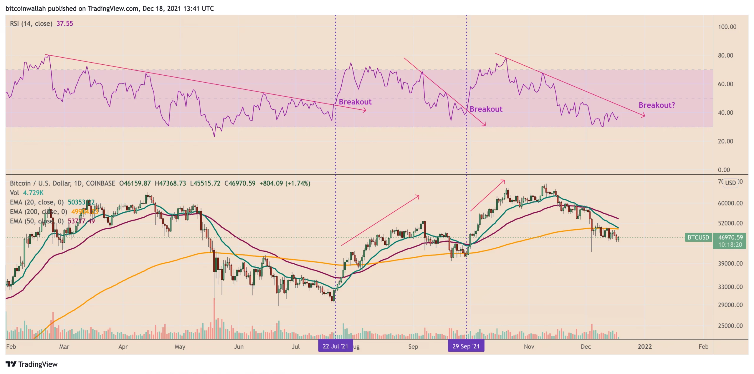 نمودار چهار ساعته BTC/USD که روندهای RSI را از سپتامبر 2021 و دسامبر 2021 مقایسه می کند