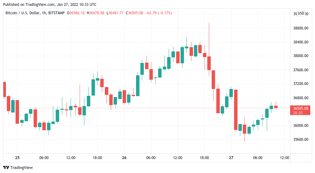دادههای Cointelegraph Markets Pro و TradingView نشان میدهند که جفت ارز BTC/USD برخی از سودهای خود را که در Bitstamp به 38950 دلار رسیده بود، از دست داد. سپس این جفت ارز روی 36000 دلار ماند، سطحی که در زمان نوشتن این مقاله در آن معامله می شد.