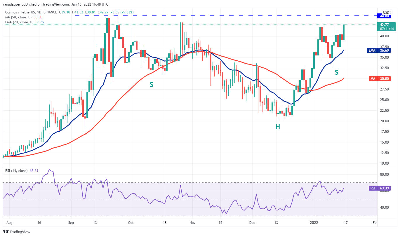 Cosmos (ATOM) در حال تلاش برای تشکیل یک الگوی سر و شانه معکوس است که در یک شکست کامل شده و بالاتر از مقاومت بالای سر در 44.80 دلار بسته می شود.