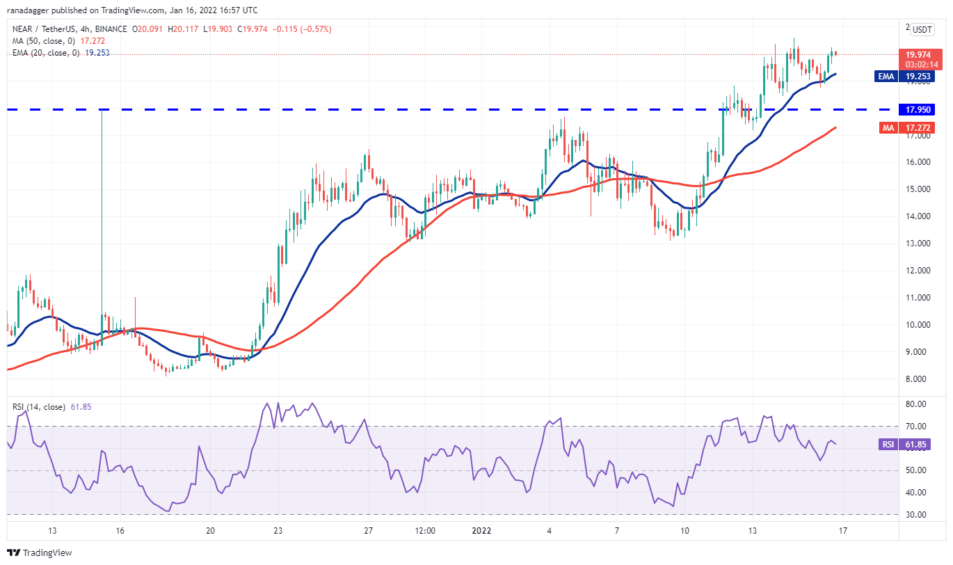 هر دو میانگین متحرک شیب دار هستند و RSI در محدوده مثبت قرار دارد، که نشان می دهد در مسیر صعودی کمترین مقامت وجود دارد. اگر گاوها اجازه ندهند قیمت به زیر سطح شکست در 17.95 دلار سقوط کند، جفت ارز NEAR/USDT می تواند تا 25.44 دلار افزایش یابد.