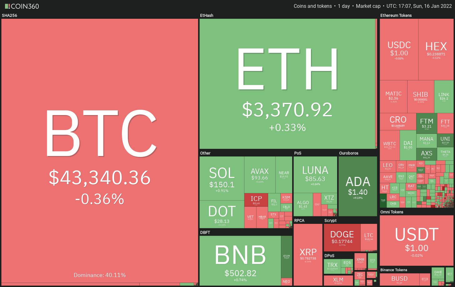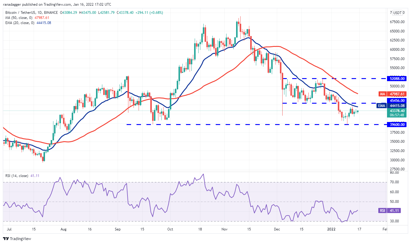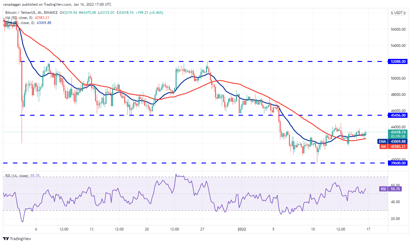 گاوها در تلاش هستند تا بیت کوین را به بالاتر از میانگین متحرک نمایی 20 روزه (44415 دلار) در چند روز گذشته برسانند، اما یک نکته مثبت این است که خریدارانتسلیم نشده‌اند. این نشان می دهد که خریداران در هر افت قیمت جزئی خرید می کنند.